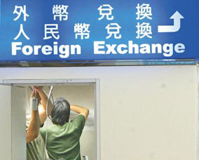 臺灣“中央銀行”下周一(30日)起核準銀行可買賣人民幣,松山機場里的銀行柜臺正加緊整裝,掛上可兌換人民幣的招牌。臺灣《聯合報》記者林俊良攝