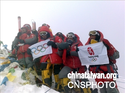 北京奧運圣火成功登頂珠峰:展示火炬、國旗、奧運五環旗、會徽旗