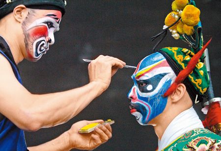 圖為開課前臺(tái)灣丑角演員林朝緒(左)幫師弟曾冠東(右)化妝。圖片來(lái)源:臺(tái)灣中國(guó)時(shí)報(bào)
