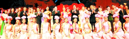 本報臺北訊 (記者王大慶)12月15日晚,能夠容納2500人的臺北中山紀念館座無虛席,大型樂舞《河洛風》在這里精彩上演。中共中央委員、河南省委原書記、省人大常委會主任徐光春,省委常委、宣傳部長、副省長孔玉芳,省委常委、秘書長曹維新出席,中國國民黨副主席曾永權夫婦,臺北世貿中心董事長王志剛夫婦、國民黨副秘書長張榮恭夫婦應邀觀看演出。