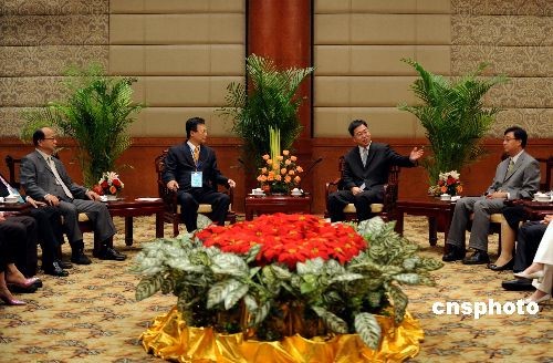 6月26日,國家旅游局副局長杜江在北京國際飯店會見臺灣中部四縣市負(fù)責(zé)人,臺中市市長胡志強(qiáng)、彰化縣縣長卓伯源、臺中縣縣長黃仲生、南投縣農(nóng)業(yè)處處長陳朝旺。 中新社發(fā) 廖攀 攝