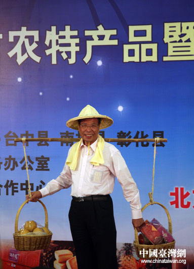 臺(tái)中縣縣長(zhǎng)黃仲生變身“臺(tái)中老農(nóng)”,為臺(tái)中農(nóng)特產(chǎn)大力營(yíng)銷(xiāo)。(中國(guó)臺(tái)灣網(wǎng) 鐘寶華 攝)