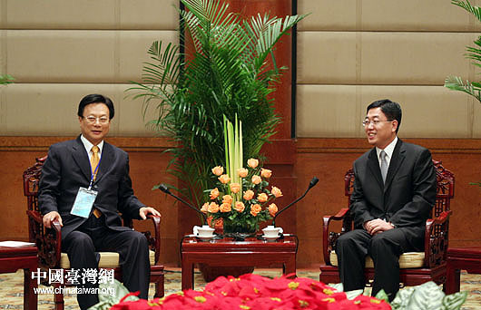 國家旅游局副局長杜江26日會見來京營銷農特產(chǎn)品和旅游的臺中市、彰化縣、臺中縣、南投縣主要負責人。杜江同彰化縣縣長卓伯源交談。(中國臺灣網(wǎng) 鐘寶華 攝)