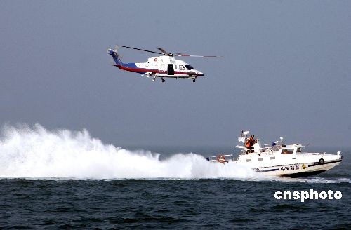 2008年10月23日下午,廈金航線海上搜救演習在廈門灣水域舉行,海峽兩岸共出動25艘船舶、16艘輔助船舶以及兩艘直升機參與演習。演習的目的是為了檢驗兩岸直航航線搜救應急預案的科學性和可操作性,檢閱實際搜救指揮協調能力和搜救成效,以更好地保障廈金航線海上運輸和海上作業安全。圖為直升機配合海事救助船只進行演練。 中新社發 王東明 攝