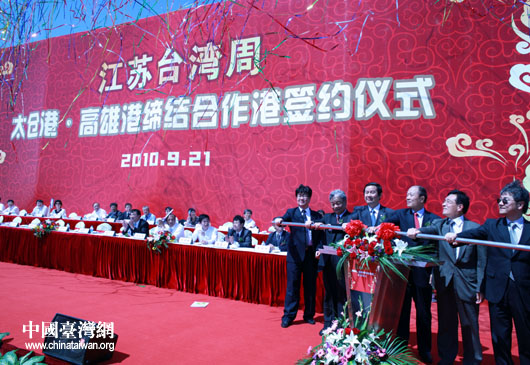 海協會駐會副會長李炳才(右二)等出席太倉港與高雄港締結合作港簽約儀式,并共同為兩港締結合作推桿起航。(中國臺灣網 鐘寶華 攝)