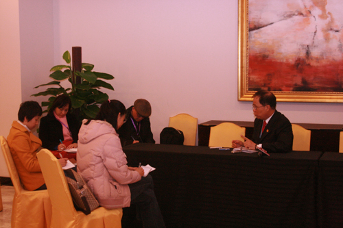 4月17日臺(tái)企聯(lián)換屆選舉結(jié)束后,選委會(huì)主任、臺(tái)企聯(lián)新聞發(fā)言人葉惠德向兩岸記者介紹了臺(tái)企聯(lián)換屆選舉結(jié)果及倡議為青海玉樹賑災(zāi)捐款的情況。