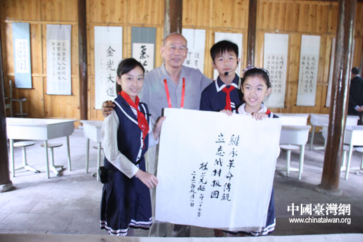 黃埔同學會會長林上元先生與武昌實驗小學的小講解員代表合影。(中國臺灣網 李丹 攝)