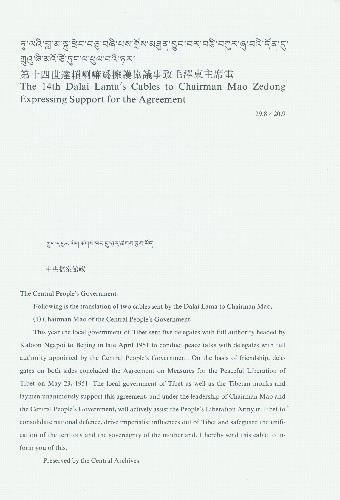 中央人民政府毛主席:今年西藏地方政府特派全權(quán)代表噶倫阿沛等五人于1951年4月底抵達(dá)北京,與中央人民政府指定的全權(quán)代表進(jìn)行和談。雙方代表在友好基礎(chǔ)上已于1951年5月23日簽訂了關(guān)于和平解放西藏辦法的協(xié)議。西藏地方政府及藏族僧俗人民一致?lián)碜o(hù),并在毛主席及中央人民政府領(lǐng)導(dǎo)下積極協(xié)助人民解放軍進(jìn)藏部隊鞏固國防,驅(qū)逐帝國主義勢力出西藏,保護(hù)祖國領(lǐng)土主權(quán)的統(tǒng)一,謹(jǐn)電奉聞。