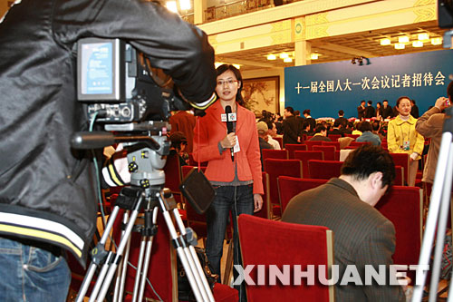 3月18日上午8時30分,人民大會堂三樓記者席已是“座無虛席”。這是電視記者在現場試鏡。 新華社記者尹棟遜攝
