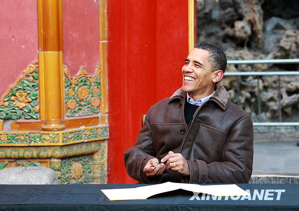 11月17日,正在中國進行國事訪問的美國總統奧巴馬參觀北京故宮。這是奧巴馬在留言簿上留言。新華社記者龐興雷攝