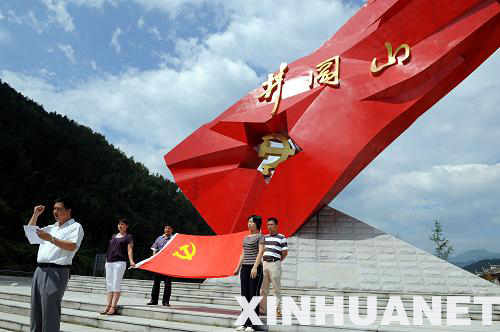 6月30日,江西省井岡山市廈坪鎮(zhèn)基層黨員干部在井岡紅旗雕塑下宣誓,重溫入黨誓詞!捌咭弧眮砼R之際,前來江西井岡山祭奠革命先烈的黨員干部絡繹不絕。他們重溫入黨誓詞,學習井岡山精神,迎接黨的88歲生日。新華社記者 馬平攝