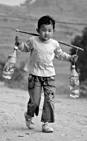 近日,云南石林縣大石橋村,送水車來(lái)了,6歲的小孩楊云潤(rùn)用飲料瓶幫家里人挑水。黃興能 攝