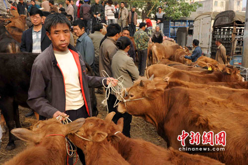 秦大章夫婦看上了馮元達(dá)一頭不到兩歲的小牛,“沒換牙齒、蹄也不錯(cuò)。”秦大章很內(nèi)行的告訴記者。在此后近30分鐘的時(shí)間里,一場在2300元至1900元人民幣之間的價(jià)錢拉鋸戰(zhàn)進(jìn)行起來。最終,在周邊人的撮合下,秦大章以2010元的價(jià)錢買到了他看上的小牛。