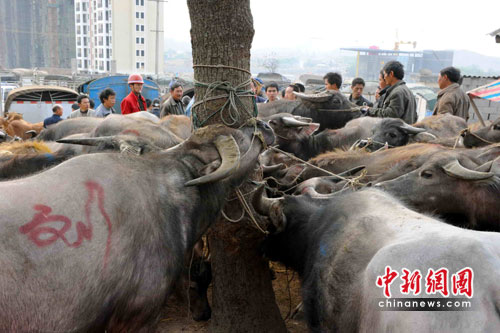 牛馬市場內(nèi)拴在樹干上待售的耕牛。 中新網(wǎng)發(fā) 曹多然 攝