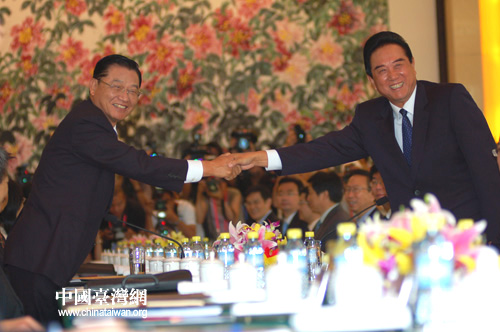 陳云林和江丙坤親切熱烈握手。(攝影:中國(guó)臺(tái)灣網(wǎng) 田云鵬)
