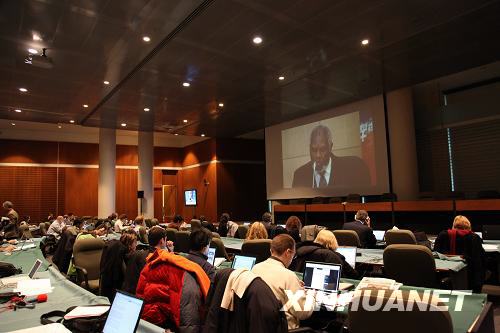 這是1月25日在加拿大蒙特利爾拍攝的海地震后重建部長級會議新聞中心(圖中投影儀上顯示海地總理貝勒里夫正在會議上發言)。海地震后重建部長級會議當日在此召開。新華社記者張大成攝