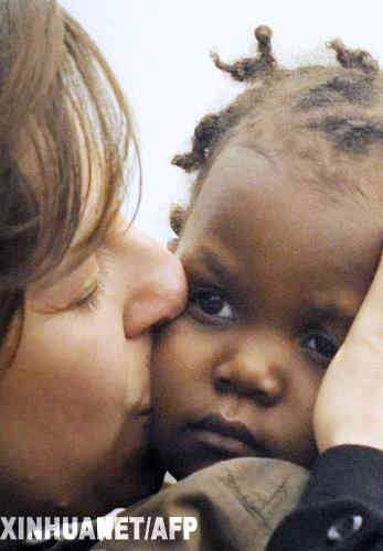 1月22日,在法國巴黎戴高樂機場,一名婦女親吻她領養的海地兒童。新華社/法新