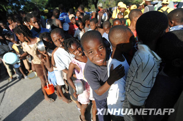 1月20日,在海地首都太子港,孩子們排隊領取食物。 1月12日,海地發生里氏7.3級地震,造成人員傷亡和重大財產損失。國際社會紛紛伸出援手,向海地提供人道主義援助。新華社/法新