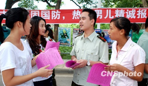 據總參動員部有關部門領導介紹,今年高校應屆畢業生人數約為610萬人,其中已確定為預征對象的近13萬人。我國兵員征集對象主體調整始于2008年。當年6月,總參謀部、總政治部和教育部、公安部、民政部聯合下發通知,宣布將征集對象主體從農村青年、城鎮待業青年調整為全日制高中以上層次各級各類學校應屆畢業生。當年底,3.9萬余名高校畢業生攜筆從戎。