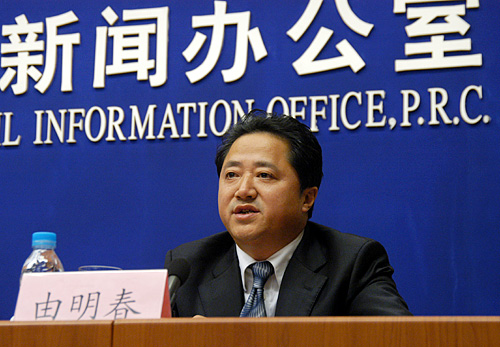 圖為財(cái)政部社會保障司副司長由明春回答記者提問。(新華網(wǎng) 陳競超 攝)