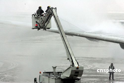 2月2日上午,2008年兩岸春節包機上海航點首個航班——東航MU五00七次航班,冒著數十年未遇的罕見風雪在上海浦東機場起飛。圖為浦東機場為春節包機優先提供特別的除冰服務。 中新社發 潘索菲 攝