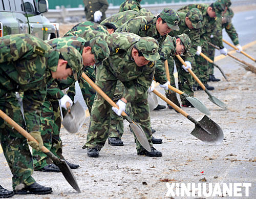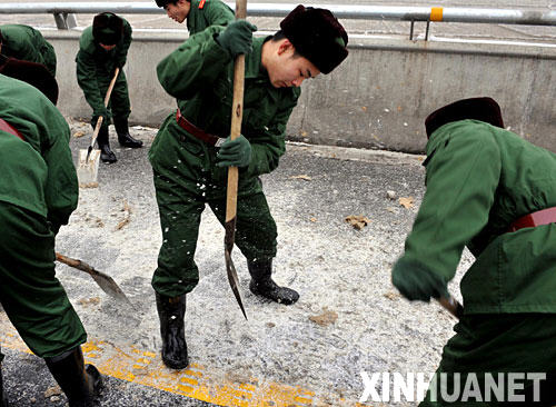 連日來,江西災害性雨雪冰凍天氣持續,為江西1959年有氣象記錄以來最嚴重的災害性天氣。江西省軍區官兵、武警官兵和民兵預備役人員緊急出動全力抗擊雪災,清理道路、橋梁、車站的積雪和結冰,搶救受困群眾,維持社會正常秩序。 新華社記者 宋振平攝