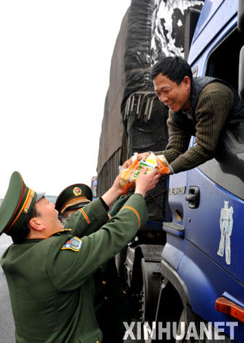 1月30日,武警江西總隊后勤部官兵在滬昆高速公路上為來往的車輛免費發放食品和飲料。