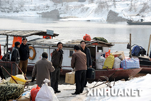 1月31日,返鄉人員乘渡船回家。 地處大別山區的安徽霍山縣自1月12日起遭受50年一遇的特大雪災,山路不通導致許多山區群眾返鄉和出行受阻。當地政府在確保安全的情況下,利用佛子嶺水庫的有利條件加強水路客運,臨時增調十幾條旅游船充當客運船,目前共20多條客運船只日均運輸客流1000人左右。當地政府和相關部門采取24小時安全監控等多項措施確保乘客安全。