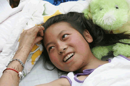 5月20日,記者在四川省廣元市中心醫(yī)院再次看到何翠青,這位堅(jiān)強(qiáng)的小女孩躺在露天病床上,全身不能動(dòng)彈,但仍保持著微笑。當(dāng)記者問(wèn)何翠青后悔不后悔返回寢室救人,這位救人小英雄說(shuō):“不后悔!遺憾的是我沒(méi)有救出更多的同學(xué)!”