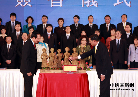 12月21日下午,海協(xié)會(huì)會(huì)長(zhǎng)陳云林與海基會(huì)董事長(zhǎng)江丙坤正式簽署《海峽兩岸醫(yī)藥衛(wèi)生合作協(xié)議》,雙方并在協(xié)議簽署后互贈(zèng)禮品。圖為海基會(huì)致贈(zèng)海協(xié)會(huì)方面的陶土作品《齊心傳唱 和諧天籟》。(中國(guó)臺(tái)灣網(wǎng) 鐘寶華 攝)
