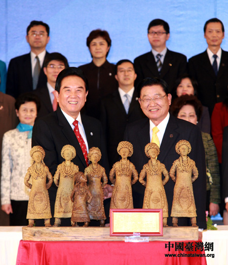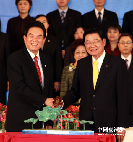 12月21日下午,海協(xié)會(huì)會(huì)長(zhǎng)陳云林與海基會(huì)董事長(zhǎng)江丙坤正式簽署《海峽兩岸醫(yī)藥衛(wèi)生合作協(xié)議》,雙方并在協(xié)議簽署后互贈(zèng)禮品。圖為海協(xié)會(huì)致贈(zèng)海基會(huì)方面的雕塑作品《好事連連》。(中國(guó)臺(tái)灣網(wǎng) 鐘寶華 攝)