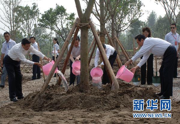 6月30日,陳云林(前右)、江丙坤(前左)在重慶照母山植物園為“合作共贏樹”澆水。當日,海峽兩岸關系協(xié)會會長陳云林與臺灣海峽交流基金會董事長江丙坤來到重慶照母山植物園,共同種下了“合作共贏樹”,慶祝雙方成功簽署《海峽兩岸經(jīng)濟合作框架協(xié)議》《海峽兩岸知識產(chǎn)權保護合作協(xié)議》。新華社記者 陳誠攝