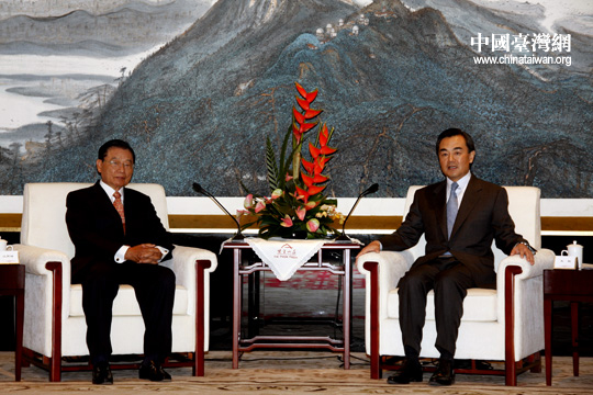 26日下午,中臺辦、國臺辦主任王毅(右)在南京紫金山莊會見了由江丙坤率領的臺灣海基會協商代表團一行。(中國臺灣網 鐘寶華 攝)