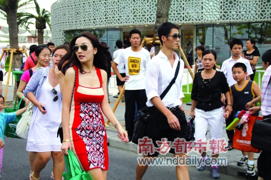 剛剛打完乒超常規賽的王勵勤昨天和一紅衣美女同游上海世博會,兩人走出沙特館后都迅速戴上墨鏡,并保持至少一米的距離。與他們同行的還有王勵勤的父母及另一名年輕女子,那名年輕女子見到記者拍照,馬上上前阻止。