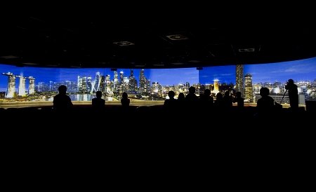 4月24日,上海世博園區(qū),試運(yùn)營(yíng)中的2010 年上海世博會(huì)新加坡館中影音室里四格屏幕正在播放新加坡館主題MV。早報(bào)記者 魯海濤 圖
