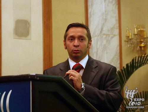 巴西貿易與投資促進局主席、世界投資促進機構協會主席兼上海世博會巴西館總代表亞歷山德羅?特謝拉介紹展館情況