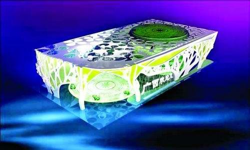 主題為“綠色家園藍色夢想”的2010年世博廣西館總展示空間為600平方米。外立面設計抽取桂樹的形象概念,構成家園的“綠色長城”。展館內營造藍色鉆石互動八維光影空間,頂部寫真墻波光搖曳,海豚悠閑自在,地面反射光影,渾然天成一副海底世界,對應了另一主題———“藍色夢想”。