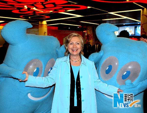 5月22日,美國(guó)國(guó)務(wù)卿希拉里·克林頓在上海世博園中國(guó)館參觀時(shí)與“海寶”親密接觸。 新華社記者張明攝