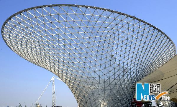 5月24日,一名工人在清洗世博園里的陽光谷。位于世博軸上的6個巨型透明“喇叭花”——陽光谷,每個高40米左右、開口最大直徑96米,從地下6.5米延展到地上35米,能將陽光、空氣引入世博園地下空間,運用生態(tài)技術(shù)節(jié)約能源。新華社記者 楊世堯 攝