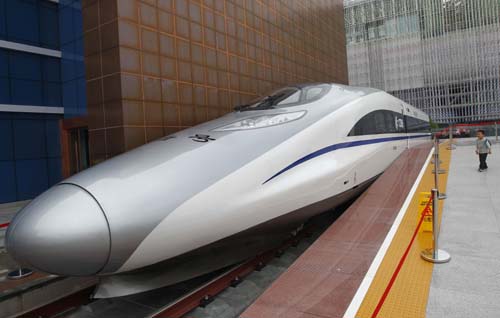 由中國南車集團股份有限公司制造的新一代高速動車組列車被放置在世博園中國鐵路館外。這種帶有CRH380A標志的新一代高速動車組,最高運行時速可達380公里,是目前世界上商業運營速度最快、科技含量最高的高速列車。據介紹,京滬高鐵建成之后,該型號列車將在京滬兩地之間運行。
