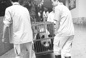 下午2時,運輸車輛經過安檢、消毒后,從上海野生動物園啟程,3時到達上海動物園。在臥龍大熊貓保護研究中心的主管見證下,經過上海動物園和上海野生動物園共同檢查,確認無誤,完成動物交接。隨后,工作人員開始為熊貓串籠。10只世博熊貓似乎知道要搬新“家”,乖乖地在飼養員誘導下,一個個按照指令很爽快地進入消毒過的籠“轎”內,安穩地等候上車。