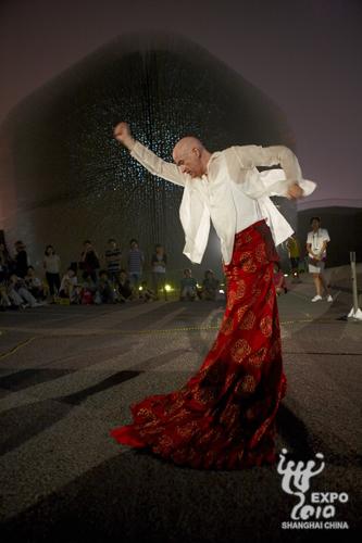 5日晚上,英國藝術家艾倫·格瑞格(Alan Greig)在“種子圣殿”前展現了精彩絕倫的蘇格蘭現代舞蹈藝術。艾倫 格瑞格是X Factor舞團的藝術總監,他的舞蹈作品集運動、刺激與娛樂性于一體,此次演出片段是根據他在2009年上海舞蹈節中首演的獨舞《Into the Light》改編而成。