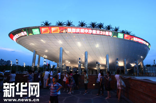 7月21日,沙特館頂部的環形屏幕打出慶祝中沙建交20周年的字幕。新華社記者 侯俊 攝