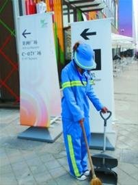 每天涌入世博園的數十萬游客,或者興致勃勃地參觀場館,或者在園區內邊走邊看,又或者圍聚在廣場遮陽傘下邊吃邊聊……在這樣一幅世博悠閑圖景外,還有這樣一群人,他們身著海寶藍工作服,遍布于園區各個角落,承擔著世博園繁重的清潔工作——他們就是世博園里的環衛工。