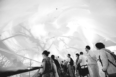 展區內的3D影院,不僅是一個影院,還是一部電梯。它非常特別,是模擬臺北101大樓的觀光電梯設計的。游客乘坐這部電梯,到101大樓的觀景臺去感受臺北。隨著電梯疾速“上升”,首先讓人感覺到整個臺北市就在你的“腳下”。短短的36秒,觀眾將到達“509米的高空”,宛如精靈的臺北市鳥藍鵲翱翔在清晨的淡水河上空,“36秒”拉開了這個城市一天的序幕:從繁忙的菜場,到臺北風格迥異的街頭藝人,再到晚間熱鬧的士林夜市,一切都井然有序地進行著。一張張不同的笑臉,都好像詮釋著同一個概念:城市,讓生活更美好。