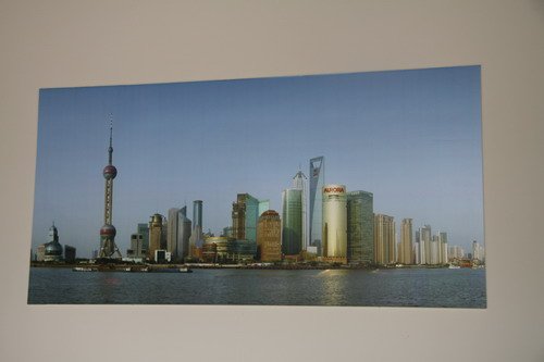震旦館的敲章處和其他館最大的不同是,除了為參觀游客在世博護照上面敲章外,還可免費為游客打印一張個性風景照并在上面敲章。在敲章處的墻壁上,掛著三幅風景畫,分別是外灘全景、良渚文化遺址和紅山文化遺址。游客可以任選其中一幅來打印并敲章。在靠墻的地方,整齊的放著四部運轉中的打印機。