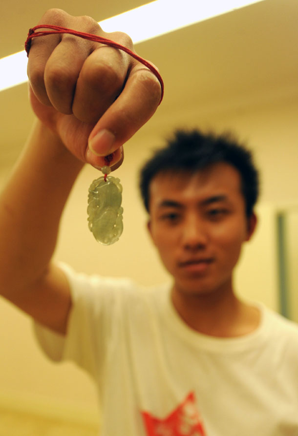 7月13日,周炳鑫展示他從小佩戴在身上的玉。新華社記者 燕雁 攝