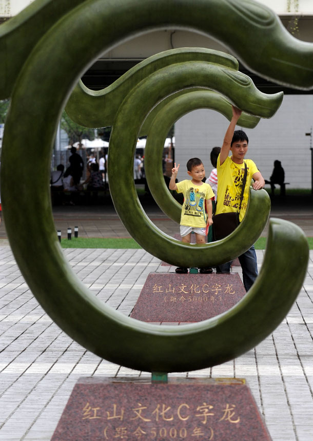 7月13日,游客在震旦館的紅山文化C字龍雕塑前留影。新華社記者 燕雁 攝