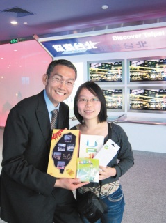 上海世博會(huì)臺(tái)北館第1萬(wàn)名參觀者,來(lái)自湖南的曠樂(lè)(右)直呼好幸運(yùn),臺(tái)北館館長(zhǎng)陳慶安(左)特別致贈(zèng)禮物。來(lái)源:臺(tái)灣《聯(lián)合報(bào)》