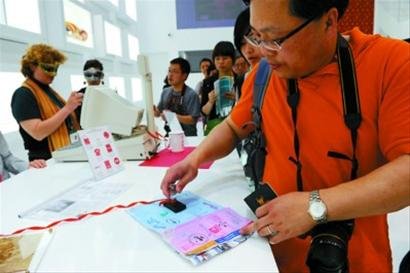 游客在浦西園區敲章 晚報記者 任國強 資料圖片